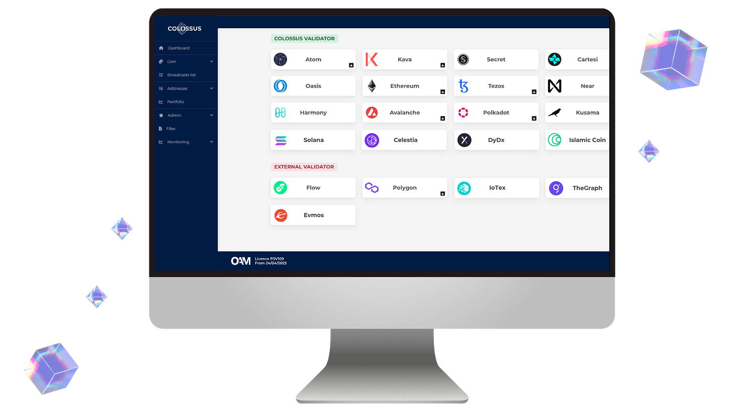 Colossus, an OAM-regulated custodian, prioritizes security, with nodes being monitored 24/7 and Custody being provided by the best providers in the industry, including Fireblocks and Ledger Enterprise.